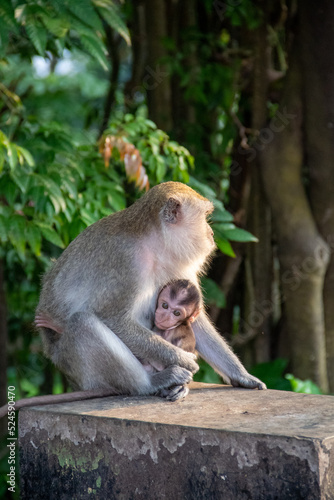 Obraz premium Mother monkey holding her cub in a protected forest area in the city