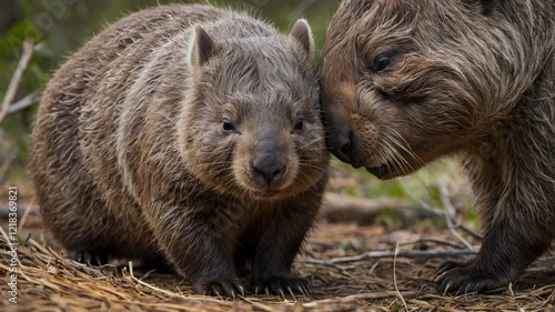 Fototapeta premium Mother Northern Hairy-Nosed Wombat with Baby: A Tender Moment