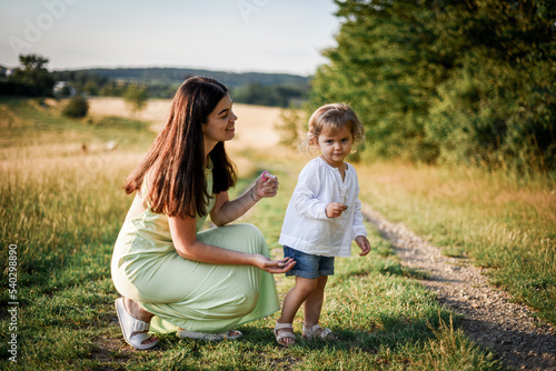 © Uliana, Fototapeta premium mother plays with her child in the evening park