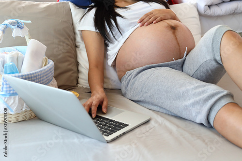 © sutichak, Naklejka premium mother pregnancy working online in home office, pregnant mom typing keyboard laptop computer
