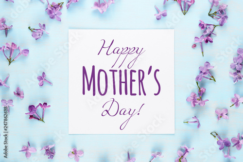 © Anatoliy Sadovskiy, Naklejka premium Mother's day card with lilac flowers on blue background