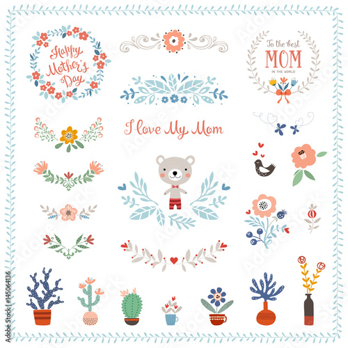 Fototapeta premium Mother's Day collection with typographic design elements. Decorative flowers, branches, floral wreaths and frames, butterfly, bird, Teddy Bear, plant pots and vases. Vector illustration.