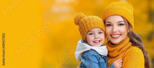 © AI04, Obraz premium Mother's Day greeting with a cheerful mother and daughter on a pink banner, including space for a message.