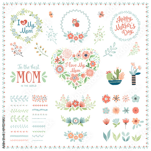 © KatyaKatya, Naklejka premium Mother's Day set with typographic design elements. Flowers, branches, brushes, wreath, floral heart, butterflies, plant pots and vases. Vector illustration.