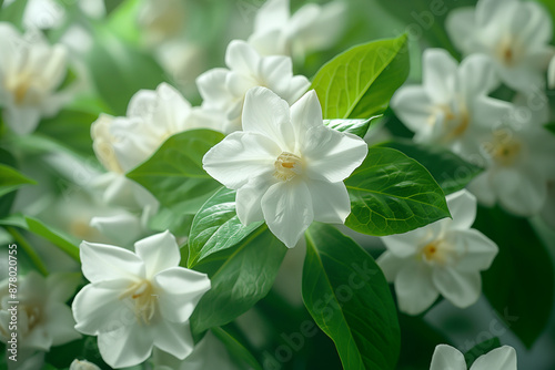 Fototapeta premium Mother’s day with white jasmine concept, Jasmine Bouquet, A close-up shot of a bouquet of jasmine flowers, showcasing their delicate white petals and lush green leaves