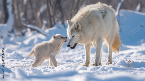 © DY, Obraz premium Mother’s Love in the Arctic: Baby Wolf’s Snowy Playtime