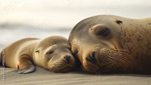 © BerkahStock, Fototapeta premium Mother sea lion and pup sleeping peacefully on sandy beach.