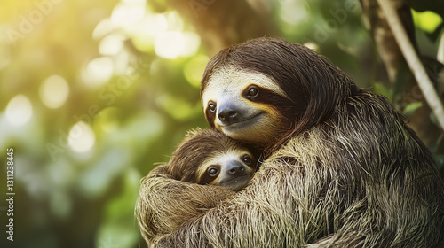 © Thanthara, Fototapeta premium mother sloth cradles her baby in lush forest setting