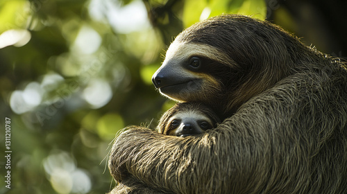 © Thanthara, Naklejka premium Mother sloth embraces baby in lush forest setting