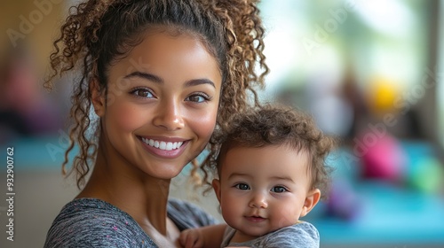 © Hvkk, Fototapeta premium mother smiling at baby while performing exercise above group exercise class fitness or pilates for parents moms staying active while boding,babies-standard-scale-_x.jpeg