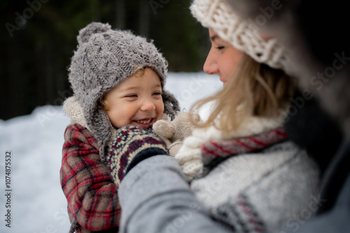 Obraz premium Mother standing in the middle of snowy landscape holding daughter in arms. Mom and girl enjoying winter holiday in the mountains.