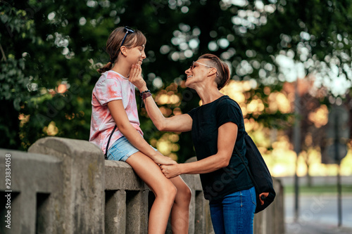 © kerkezz, Fototapeta premium Mother talking with daughter sitting at the fence