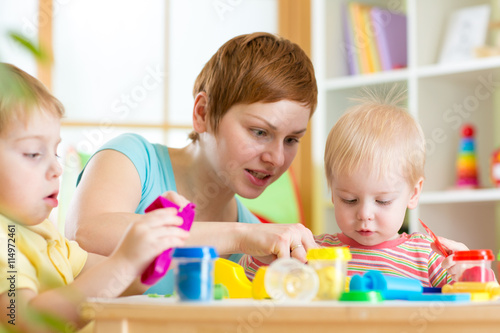 Fototapeta premium mother teaches her children to work with colorful playdough