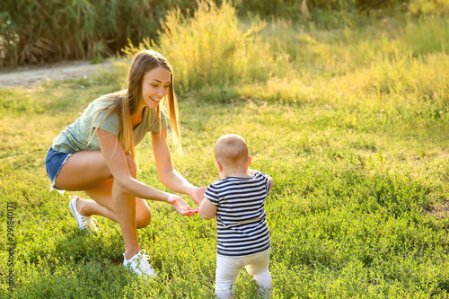Fototapeta premium Mother teaching her little baby to walk outdoors