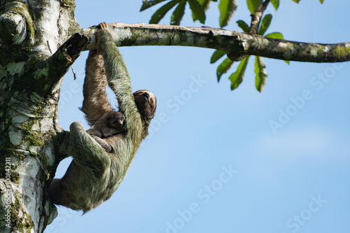 © clsdesign, Fototapeta premium Mother three toed sloth hanging from a tree branch with baby clinging to her