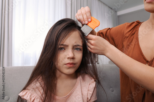 © New Africa, Fototapeta premium Mother using nit comb on her daughter's hair indoors. Anti lice treatment
