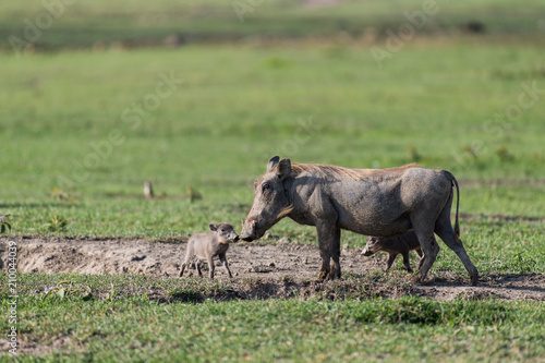 © ilyaska, Fototapeta premium Mother warthog with babies in Ngorongoro crater