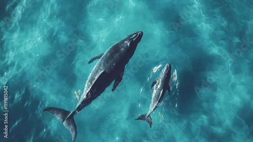 Fototapeta premium Mother whale swims alongside her calf in clear blue ocean waters, showcasing...