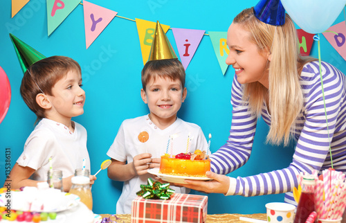 Fototapeta premium Mother with birthday cake for cute twins at party