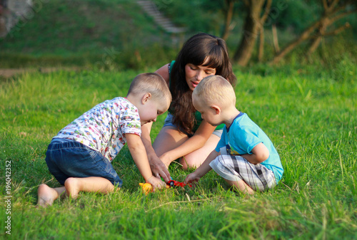 Fototapeta premium Mother with dark hair is playing with two children in the green lawn. Happy...