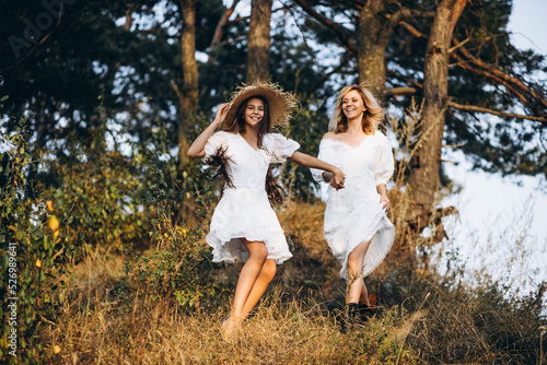 © Petro, Fototapeta premium Mother with daughter in white dresses in forest