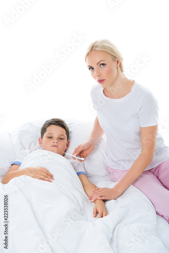 Fototapeta premium mother with electronic thermometer sitting near sick son, isolated on white