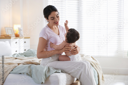 Fototapeta premium Mother with her cute little baby on bed indoors