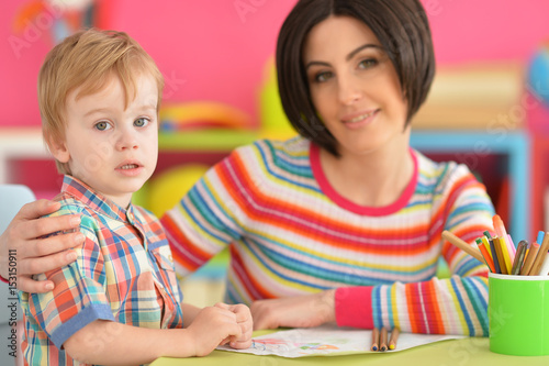 Fototapeta premium Mother with her son draw with pencils
