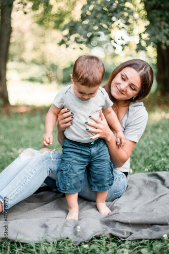 Fototapeta premium Mother with little son spend time together in green park.