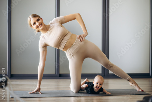 Fototapeta premium Mother with toddler daughter exercising on mat