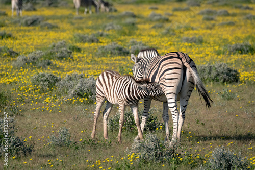 Naklejka premium Mother zebra and nursing foal. Image taken on the Okavango Delta, Botswana.