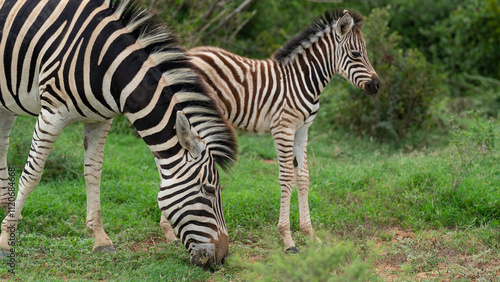 © Jose, Fototapeta premium Mother zebra grazing next to her calf, Addo Elephant National Park, South Africa