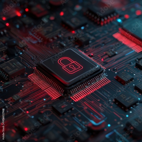 © Smaev, Obraz premium Motherboard of the future featuring digital circuits and a luminous security lock, symbolizing cutting-edge cybersecurity and data safeguarding