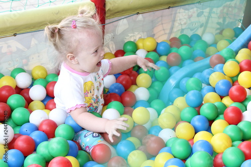 © www.akolosov.art , Fototapeta premium Mothers with babies plays in dry swimming pool and sits on the colored plastic balls.