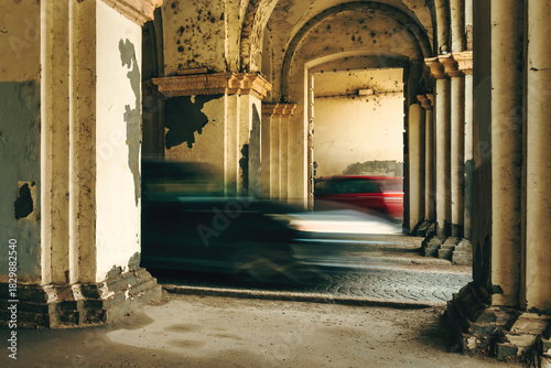 © Bits and Splits, Fototapeta premium Motion-blurred vehicles speeding through a weathered arched passageway, contrasting modern traffic with aged, crumbling architecture.