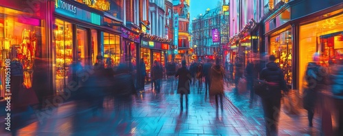 © Viacheslav, Fototapeta premium Motion blurred view of busy shopping street in London with pedestrians and vibrant storefronts
