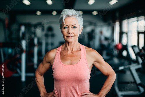 © Studio Photo AI, Fototapeta premium Motivated senior woman working out in the gym, looking confidently at the camera