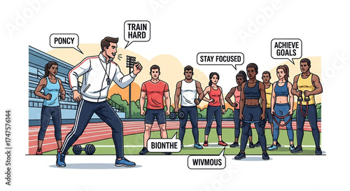 Obraz premium Motivational sports coach giving instructions to a diverse group of athletes on a running track with speech bubbles and positive affirmations
