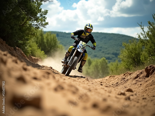Naklejka premium motocross rider speeds down a sandy trail showcasing dynamic action and...