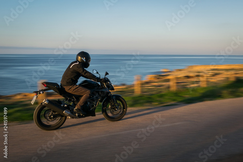© alejandro sala, Obraz premium motocyklista na przybrzeżnej drodze