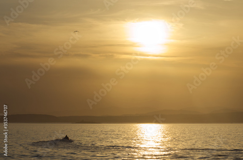 Naklejka premium Motor boat setting into the sunset on the Firth of Forth in Edinburgh
