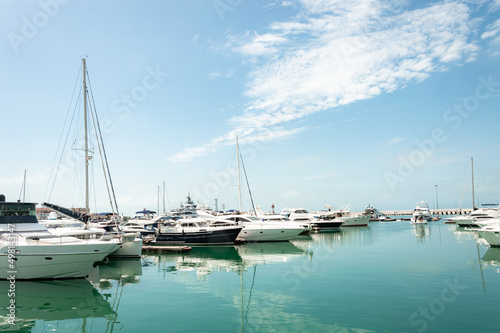 © Юлия Агафонова, Fototapeta premium Motor ships and yachts on the pier in front of the Marine Station. Close-up. Calm Black Sea. Sea trade port with mooring boats at sunset in Sochi, Russia