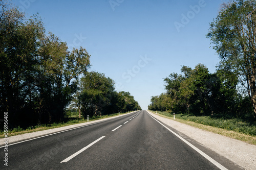 © Niko_Dali, Fototapeta premium Motor transport routes between trees laid asphalt in Ukraine pre -war period.