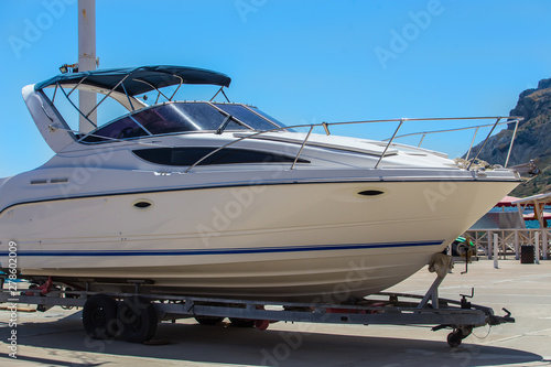 © Yuri Bizgaimer, Fototapeta premium motor yacht on on rails ashore