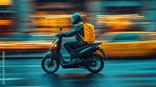 Fototapeta premium Motorbike rider wearing a helmet, speeding through a rainy city street, motion blur, bright golden light background, urban travel scene, fast and dynamic transportation
