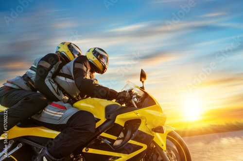 Fototapeta premium Motorbikers on sports motorbike riding in sunset