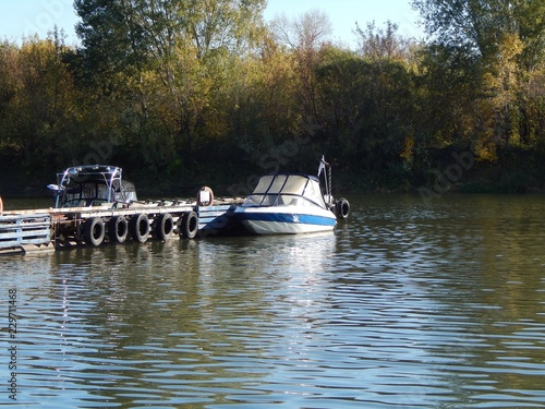 © Lyudmila, Fototapeta premium Motorboat on the pier. Boat on the lake near the pontoons in the fall. A photo.