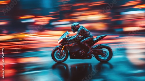 Fototapeta premium Motorcycle racing through vibrant city lights at night showcasing adrenaline...
