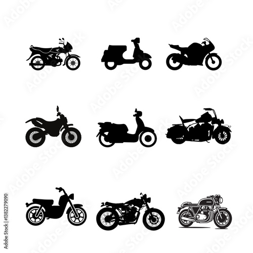 Obraz premium Motorcycle Type and Model icons Set. Vector black illustration isolated on white background with shadow.
