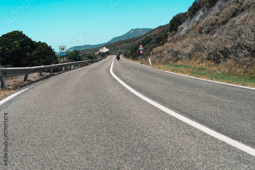 Fototapeta premium Motorcyclist driving on mountain road in summer. Sardinia. Italy.